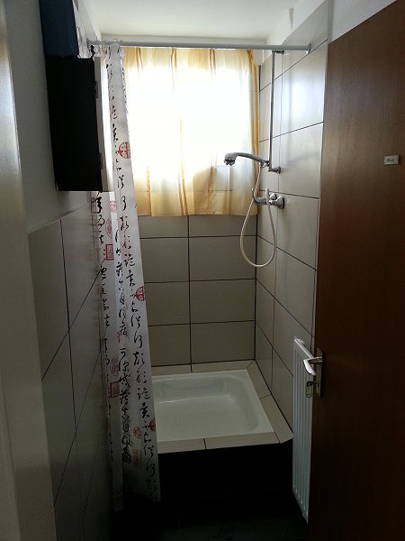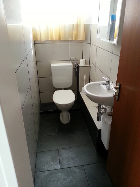 Der Duschraum und das WC mit Waschbecken befinden sich unmittelbar nebeneinander, sind durch Türen jedoch räumlich getrennt.